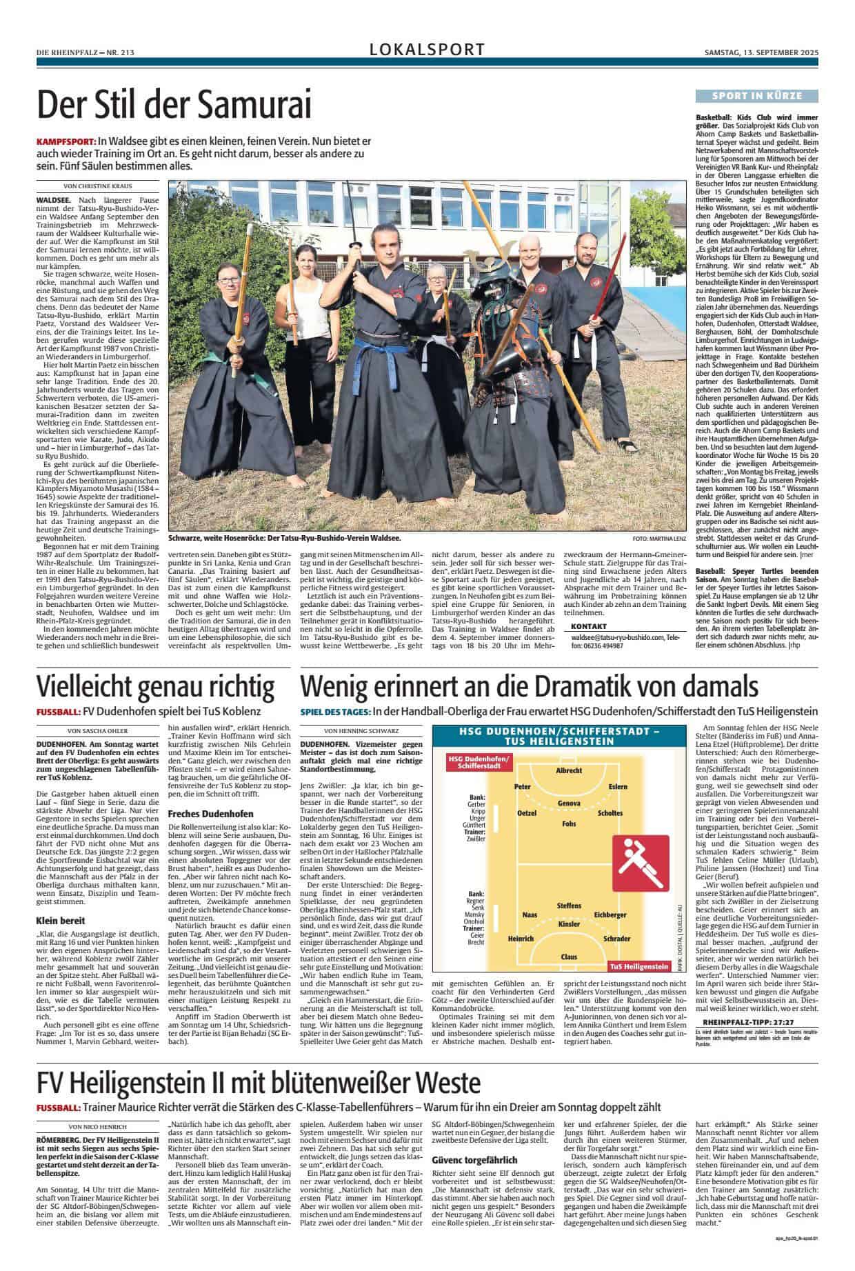 As part of preparations for the reopening of training operations, the daily newspaper Rheinpfalz visited the joint training session in Limburgerhof in the summer. ARTICLE: There is a small, fine club in Waldsee. Now it is offering training in the village again. It’s not about being better than others. Five pillars determine everything. After a long break, the Tatsu-Ryu-Bushido-Verein Waldsee resumed training in the multi-purpose room of the Waldsee Kulturhalle at the beginning of September. Anyone who wants to learn the martial art in the style of the samurai is welcome. But it’s about more than just fighting. The full article can be read here: https://www.rheinpfalz.de/lokal/speyer_artikel,-tatsu-ryu-bushido-trainiert-wieder-in-waldsee-_arid,5811611.html